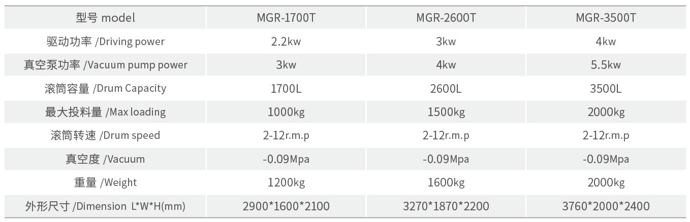 MGR-T 系列滚揉机采用摆动支架,卧式倾斜滚揉。相比MGR-H系列机型,具有更大的装载能力和更方便地卸料性能。适用于西式香肠、火腿、培根、烤肉以及传统中式禽类,酱卤类、休闲类食品的腌制加工。